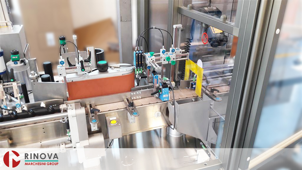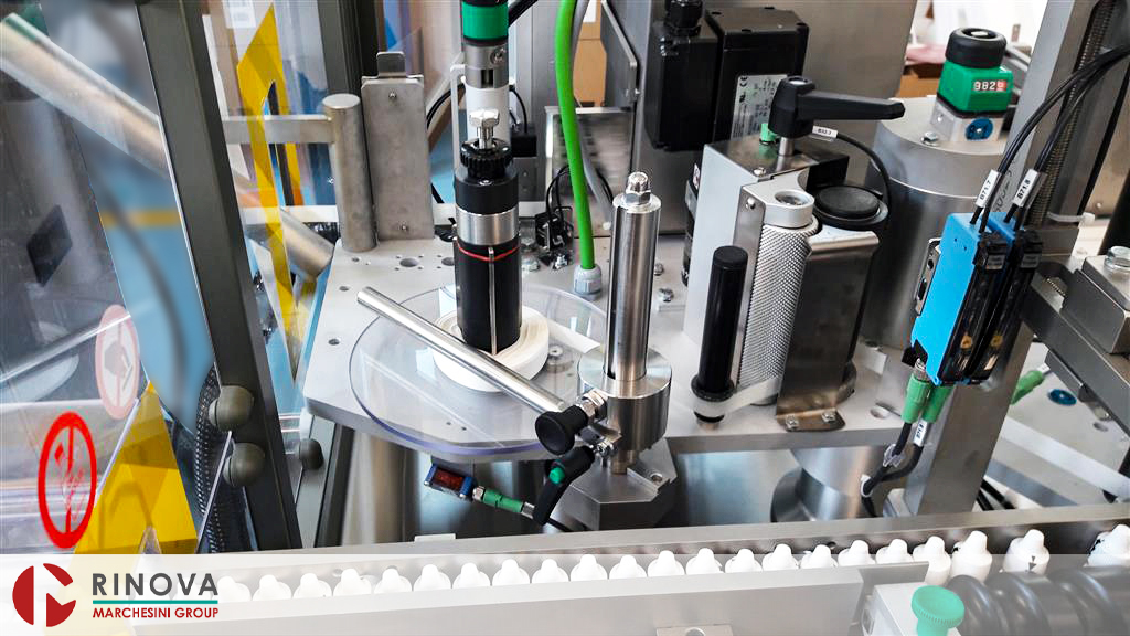 • Nastro superiore di stabilizzazione flaconi durante l’etichettatura e sistema di massaggio etichette mediante spazzole o rulli di gomma (per flaconi non cilindrici).