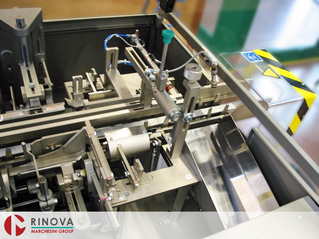 • After pre-breaking the carton is transported by a rake with alternate movement to the working station maintaining it in square. Sensor checks correct opening and calls for the leaflet (if group is mounted). A further sensor checks for product presence at the station prior to insertion. If product is missing at this point the machine stops to avoid producing an empty carton.