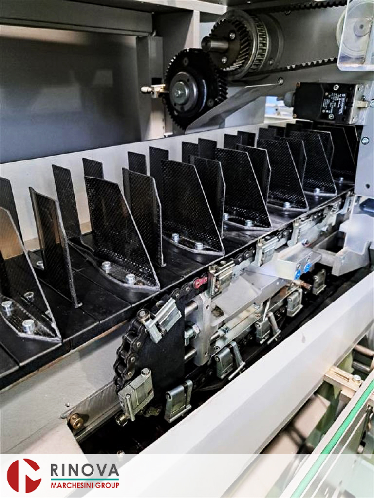 • Product insertion into the carton, arriving in a previously loaded bucket chain, achieved with a set of pushers placed opposite the operator side following the continuous motion of the lug chain.