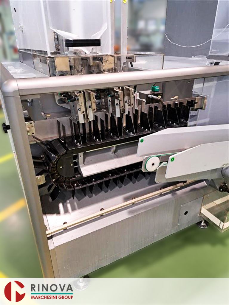 • Product bucket infeed chain designed to be connected to various available automatic feeding units. Simultaneous adjustment of all infeed buckets (related to product width) includes hand wheel and digital indicators. Product bucket infeed chain designed to be connected to various available automatic feeding units. Infeed and discharge height is 860 +/- 50mm.